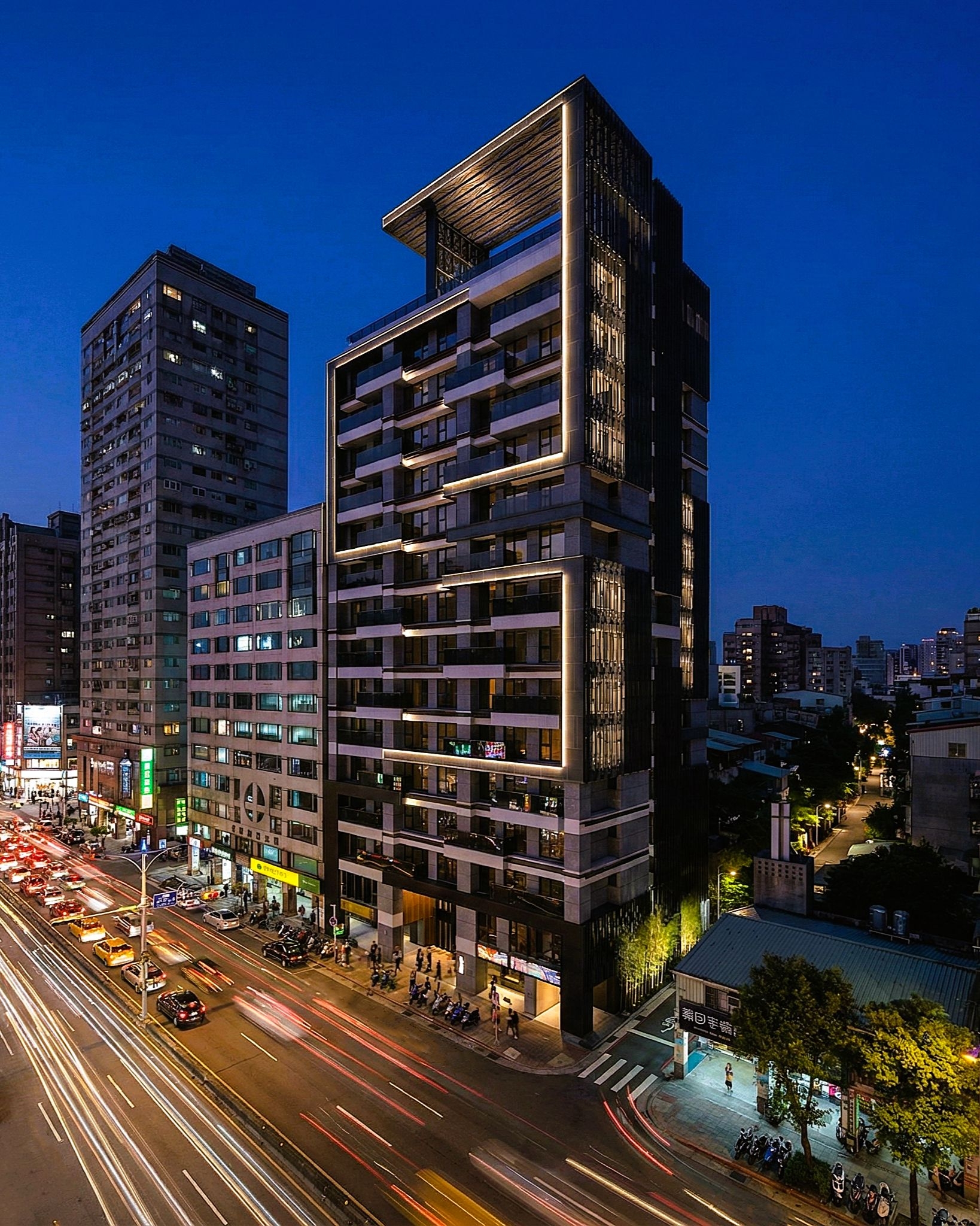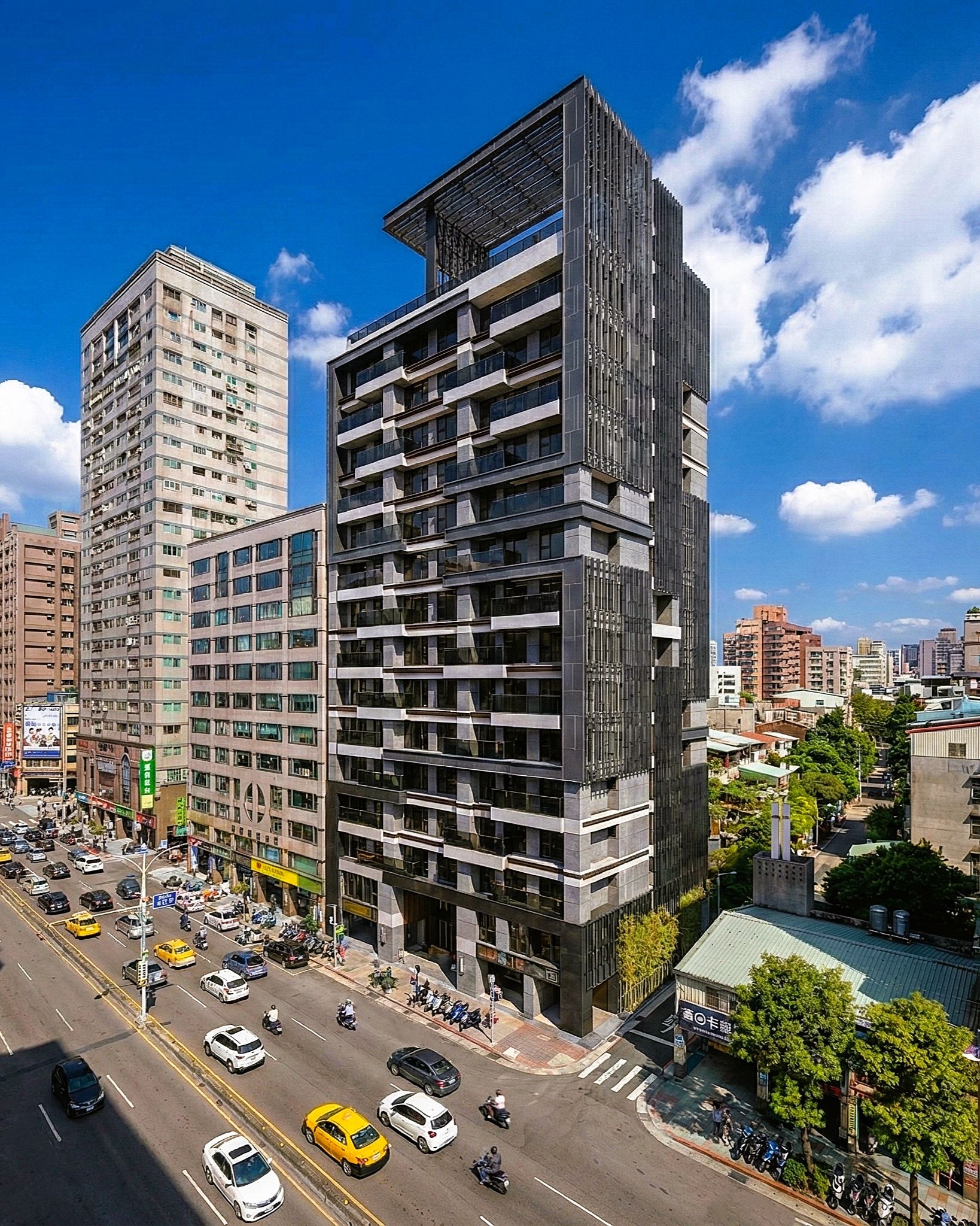 錯層陽台打破規矩的立面分隔線條,產生錯位、對望的趣味…