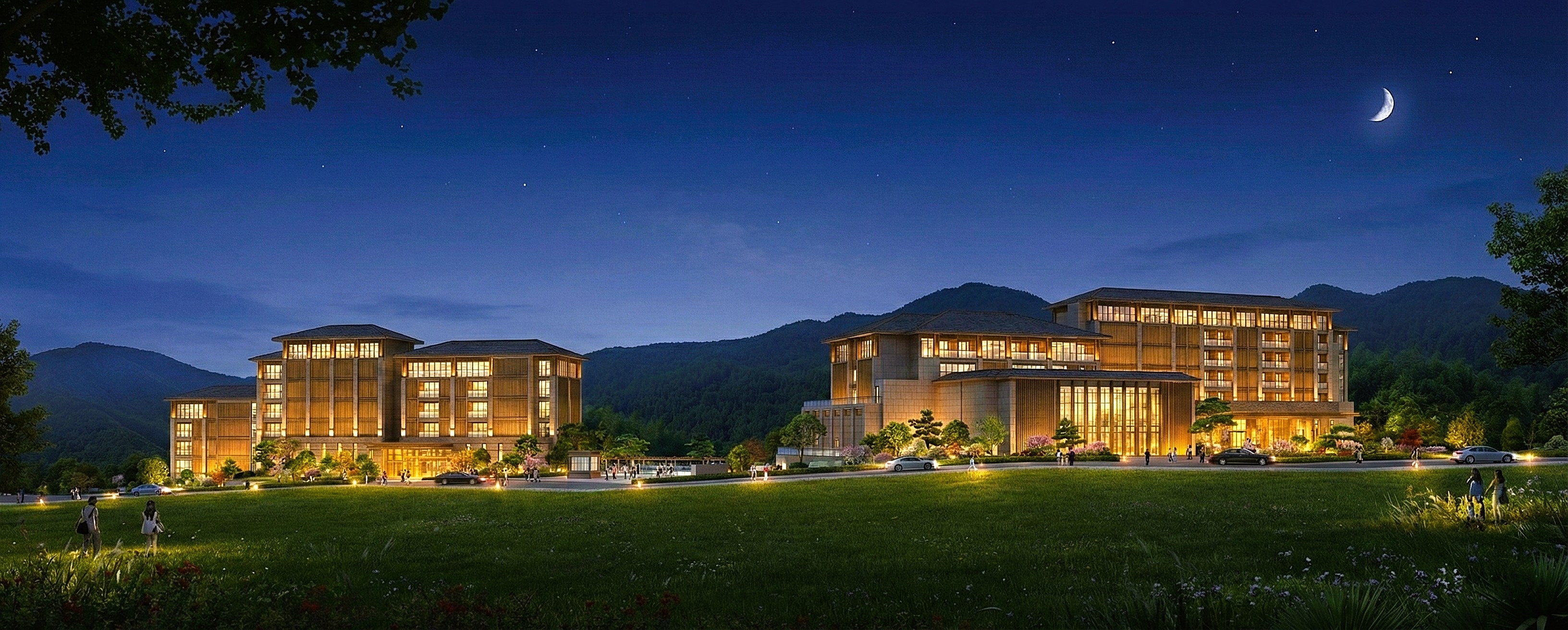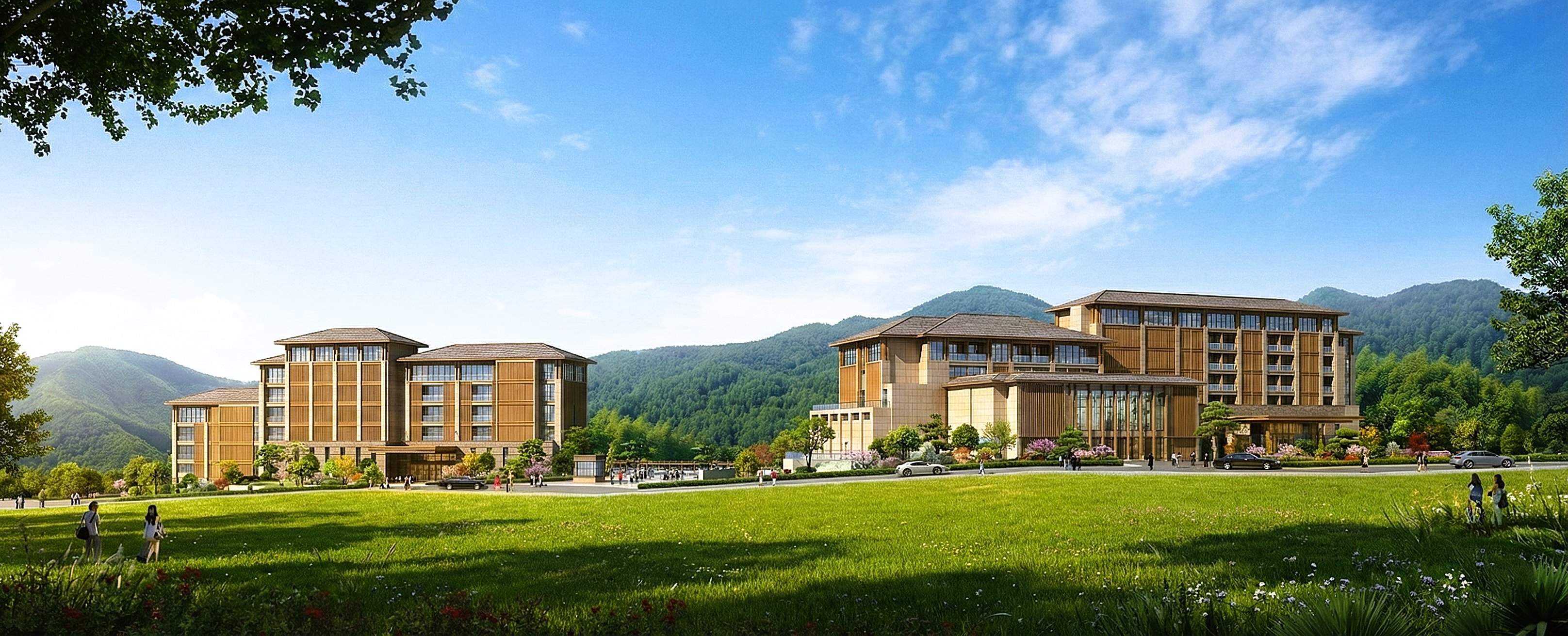 將主要建築量體配合基地周邊之森林、溪瀑等自然景觀條件分區配置,塑造出輕巧精緻、順應自然的空間意象。在高度限制範圍內,建築物順應基地地勢呈梯度延伸;外牆主要採用貼近自然的裝飾材料,如木質、石質,使建築物和諧融入周邊自然環境。